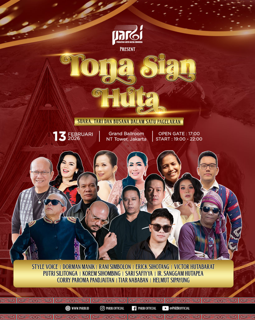 PARBI – Perhimpunan Artis Batak Indonesia – kembali menyuguhkan sebuah pertunjukan budaya yang megah bertajuk “Tona Sian Huta”. Acara ini akan berlangsung pada 13 Februari 2026 bertempat di Grand Ballroom NT Tower, Jakarta. Dengan tema “Suara, Tari, dan Busana dalam Satu Pagelaran”, pertunjukan ini menghadirkan sinergi antara musik, tarian, serta busana etnik yang khas Batak.