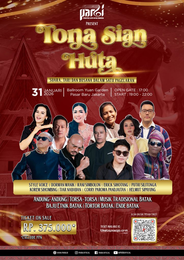 PARBI – Perhimpunan Artis Batak Indonesia – kembali menyuguhkan sebuah pertunjukan budaya yang megah bertajuk “Tona Sian Huta”. Acara ini akan berlangsung pada 31 Januari 2026 bertempat di Ballroom Yuan Garden Pasar Baru, Jakarta. Dengan tema “Suara, Tari, dan Busana dalam Satu Pagelaran”, pertunjukan ini menghadirkan sinergi antara musik, tarian, serta busana etnik yang khas Batak.